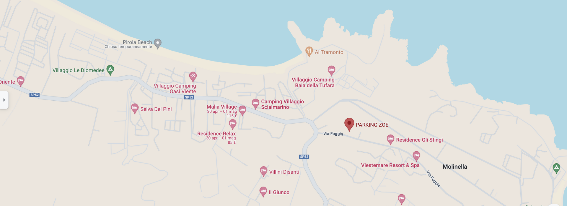 Raggiungere il nostro parking Zoe a Vieste è molto semplice, basterà raggiungerci da nord e superata la città di Peschici occorrerà raggiungere la spiaggia e la zona di Scialmarino (zona segnalata su Maps) e da qui proseguire verso la Molinella, una zona immersa nel verde e vicinissima al mare.